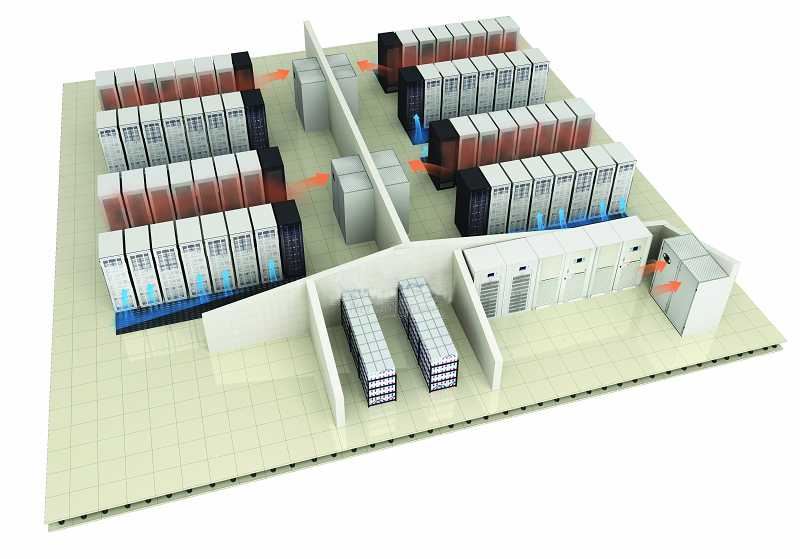 ????? 2、環(huán)境控制系統(tǒng),通常選用機房精密空調(diào)對數(shù)據(jù)中心的環(huán)境調(diào)節(jié),確保服務(wù)器等IT設(shè)備的運行環(huán)境。對于發(fā)熱量大的服務(wù)器等IT設(shè)備,通常選用高通孔率(一般大于70%)網(wǎng)孔門的機柜,提高機柜進(jìn)出風(fēng)量;將機柜面對面、背對背布置,在機房內(nèi)形成冷熱隔離的風(fēng)道,提高制冷效率;空調(diào)采用下送風(fēng)方式,確保機房送風(fēng)均勻,提高制冷效率。